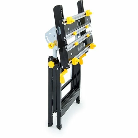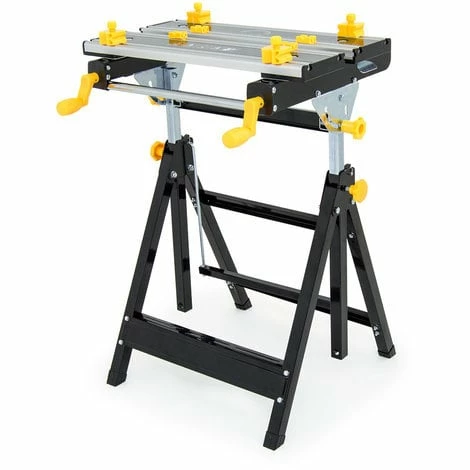 The ultimate in portable workbench design and performance. This workbench features strong steel aluminium work tops with vice clamping function. The table may be tilted to any one of 3 positions allowing cutting and working angles to be set to suit the job in hand. The height of the worktable may be adjusted to one of 6 setting points with the aid of a foot controlled locking lever. Supplied with 8 clamping blocks which slide to the required position in the jaw edges and work top grooves. Folds for easy transport and storage.Â